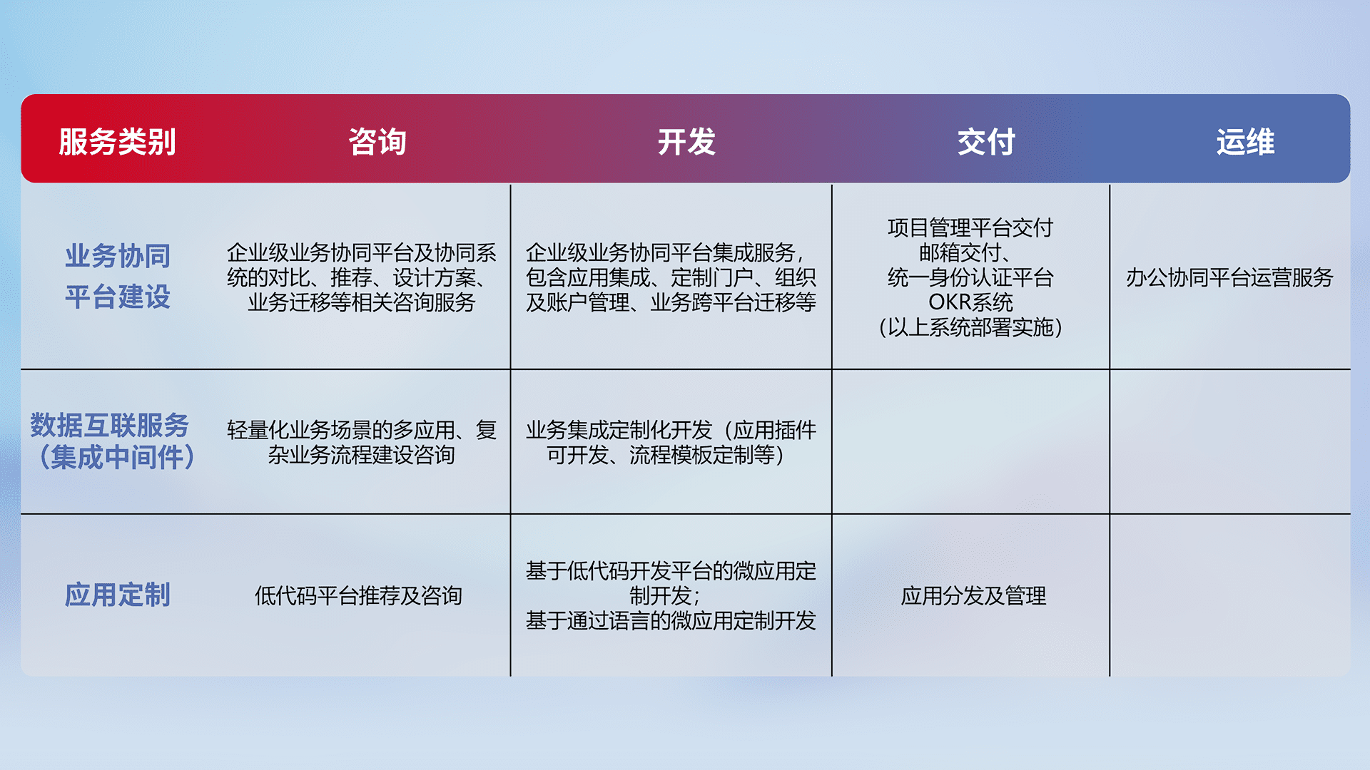 针对钉钉、、、、企微、、、、IDaas等平台级产品提供产品的规划、、方案、、交付、、、、定制化开发等服务,,,实现如统一协同办公、、、、智能客户服务、、混合会议管理、、、、智能数据查询、、等业务场景,,,,实现数字化转型。。。。